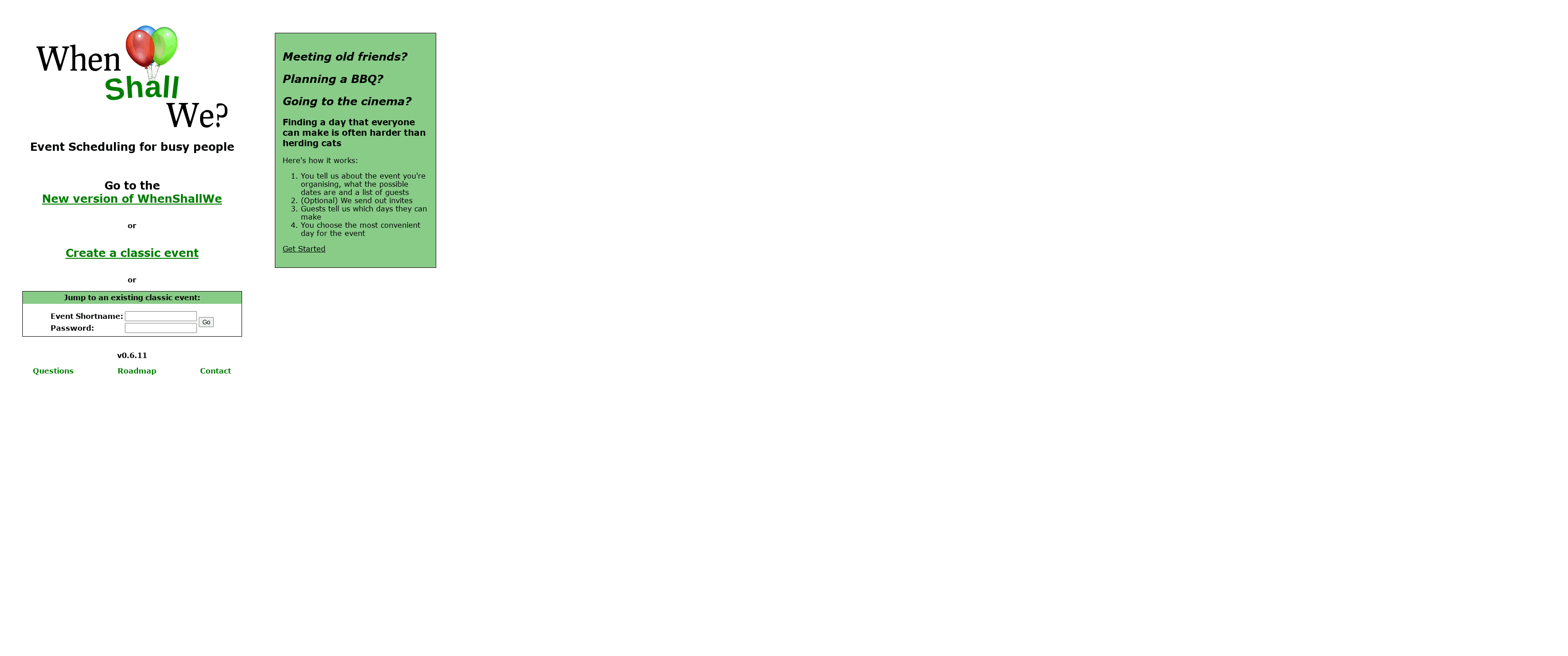 whenshallwe is a straightforward event scheduler designed to help busy people find the best day for gatherings by coordinating guest availability. It focuses on simple event creation, sharing proposed dates, and letting guests indicate when they can attend so organizers can pick the most convenient option. The interface emphasizes ease of use and supports both classic and new event formats, making it a practical choice for casual social planning. Bottom line: if you need a no-frills way to gather availability from multiple people quickly, whenshallwe gets the job done.