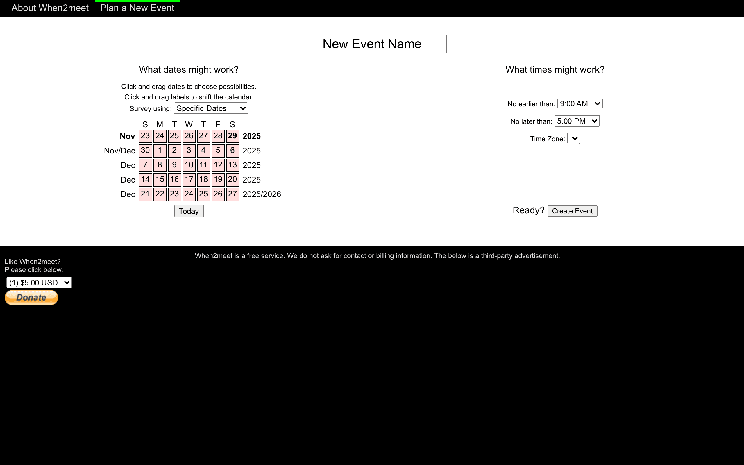 - Suitable for multi-day planning: when2meet handles events that stretch across weeks or months, which helps for vacations, retreats, and multi-session meetups.